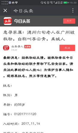 當(dāng)天下午兩點多,頭條尋人發(fā)布了該老人的尋親信息,并將其推送給了廣州和德州的部分今日頭條用戶,希望能幫他找到家人。
