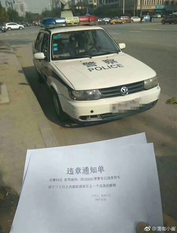 朋友圈廣泛傳播的警車違停的多幅照片顯示,車牌號為陜E1873警的制式警車停在非機動車道邊,但所停位置并不是停車位。有市民以“渭南車主”名義,給這輛違法停車的警車開具了一張打印的“違章通知單”,內容為:交警同志,您駕駛的“陜E1873警”警車已違章停車,請于三十日之內能給渭南車主一個完美的解釋。落款是“開單人:渭南車主”,時間為“2017.11.21”。