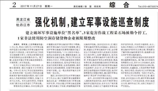 這篇題為《牡丹江市建立軍事設施巡查制度》的報道可以看出,針對軍事設施保護工作,黑龍江省牡丹江市專門成立了巡查小組。文中指出,11月上旬該小組進行了專項巡查,3家危害作戰(zhàn)工程的采石場被勒令停工,1家非法使用防空洞存儲貨物的企業(yè)接到整改命令。