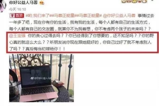來看看馬蓉發微博原文:"工作已往一年多了吧,此刻你有你的糊口,我有我的糊口,每個人私人都有本身的糊口辦法,每個人私人都有本身的結交圈,就算你不為我著想,你不思考兩個孩子的將來嗎??@王寶強(男影星)你的素心過得去嗎??你已經獲得了你想要的,還不中意嗎??你的野心真的就這么大么??聽伴侶說你此刻跟她挺好的,你本身過好了就不思考別人了嗎??真怨恨當初嫁給你!!"