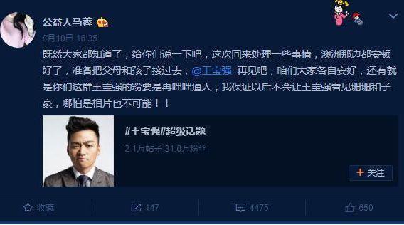 今年8月,有網友向媒體曝料,馬蓉要帶全家人移民去澳洲,初審已經通過,花了大概1500萬人民幣,這是一種有錢人辦的移民。馬蓉也通過微博喊話王寶強,叫王寶強的粉絲不要咄咄逼人,自己全家都要移民,一雙兒女當然也跟著去,粉絲們要是太過分,以后就不讓王寶強見兒女了,此話一出,粉絲們都氣炸了,底下評論說什么的都有。